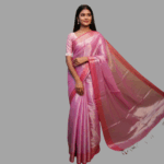 - Refined Woven Border: The saree is gracefully framed by a delicate border, likely featuring subtle Gold or Copper Zari work along with a fine band of coordinating Pink or Rose tone. This traditional detail adds structure without being overly heavy.