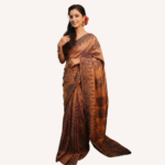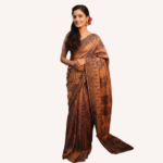 Pure Bishnupuri Silk Color Palette: Luminous Bronze/Copper, Dark Woven Motifs Weave: Traditional Handloom, Tone-on-Tone Woven Jaal Make a grand entrance with this opulent silk saree, a perfect blend of heritage weaving and modern, rich aesthetics.