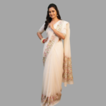 This beautiful saree embodies serene elegance, featuring a clean, luxurious base elevated by exquisite hand-stitched detailing. The saree is crafted from a fine, lightweight handloom fabric (likely a Cotton Silk blend or a fine silk), presented in a crisp, alluring Pristine White or Off-White shade, which offers an ethereal drape.