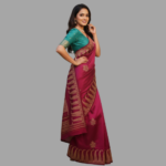 - Contrasting Blouse: The saree is beautifully paired with a contrasting Teal/Aqua blouse piece (as styled), providing a fresh and vibrant pop of color against the deep mauve. The blouse features subtle texture or metallic detailing on the sleeves.